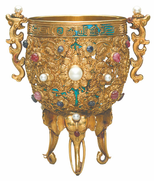 To the south lies the Gold Cup of Eternal Territorial Integrity, created during the Qianlong era (1736-95).The vessel reflects the wealth and social stability of the peak time of the Qing Dynasty, whose Emperor Qianlong was an ardent connoisseur of art.