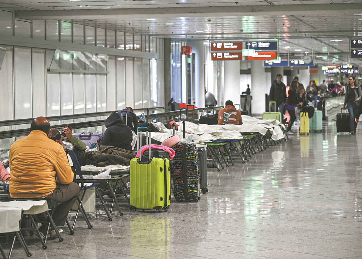 People wait on cots after drone sightings and flight cancellations at Munich Airport, on Friday. JASON TSCHEPLJAKOW/AP