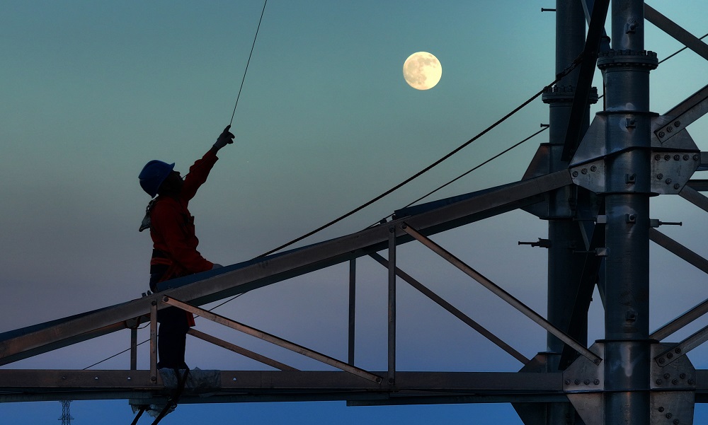 A worker installs wires on a high tower under the light of the moon (drone photo) on Oct 6, in Yanfeng district, Hengyang city, Central China's Hunan province. [Photo by Cao Zhengping/For chinadaily.com.cn]