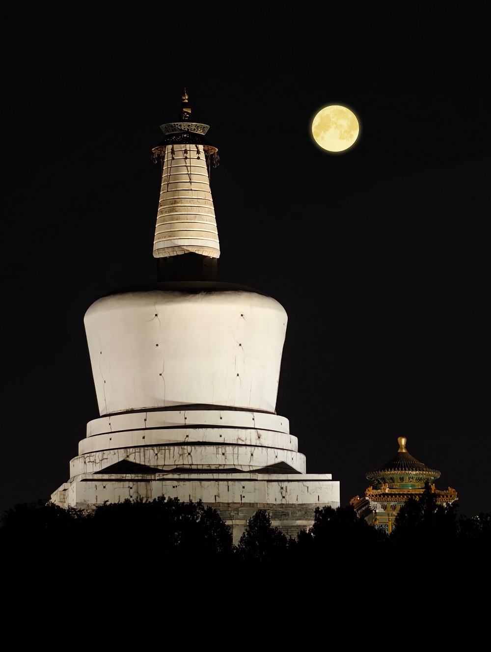A full moon forms an interesting contrast with the White Pagoda Temple in Beihai Park on Oct 6, in Xicheng district, Beijing. [Photo by Jing Weidong/For chinadaily.com.cn]