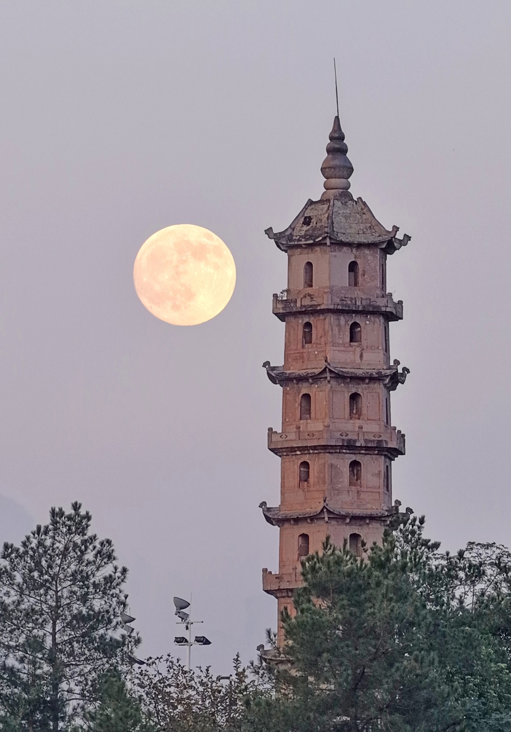A full moon rises above the Anzhou Tower on Oct 6, in Xianju county, Taizhou city, East China's Zhejiang province. [Photo by Wang Huabin/For chinadaily.com.cn]