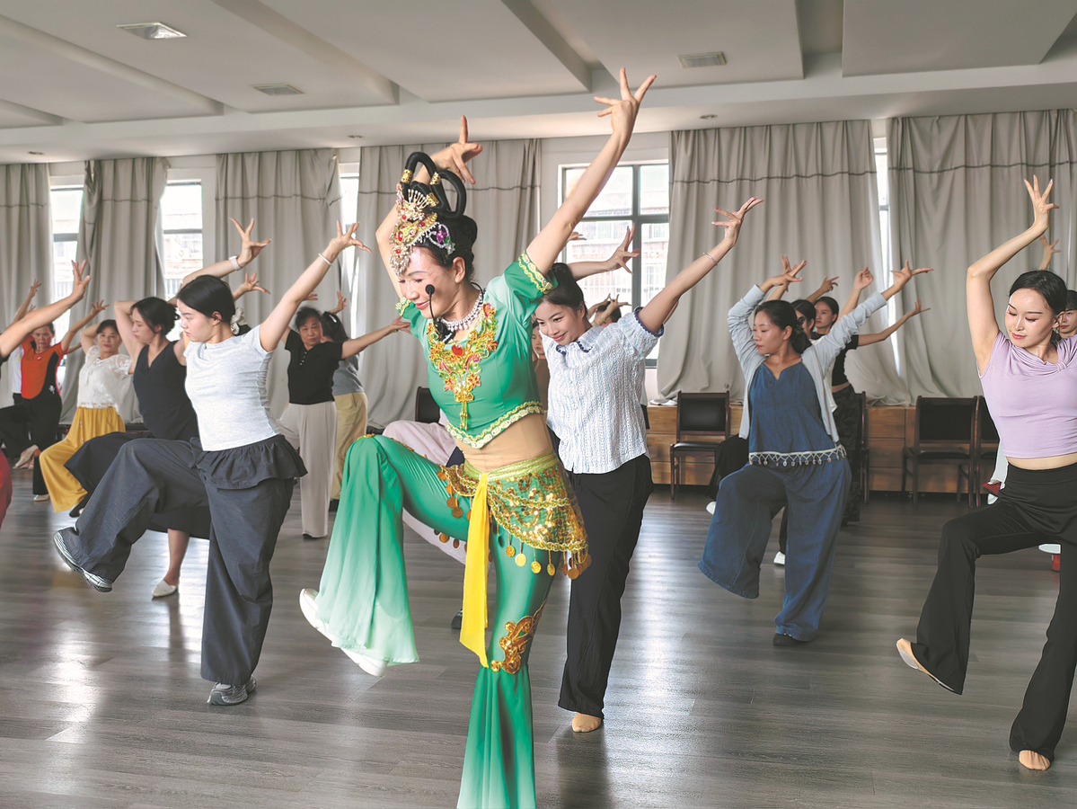 Jin Shumei (front) teaches Healthy Dunhuang Dance in Ganzhou, Jiangxi province, in August. ZHONG QIAN/FOR CHINA DAILY