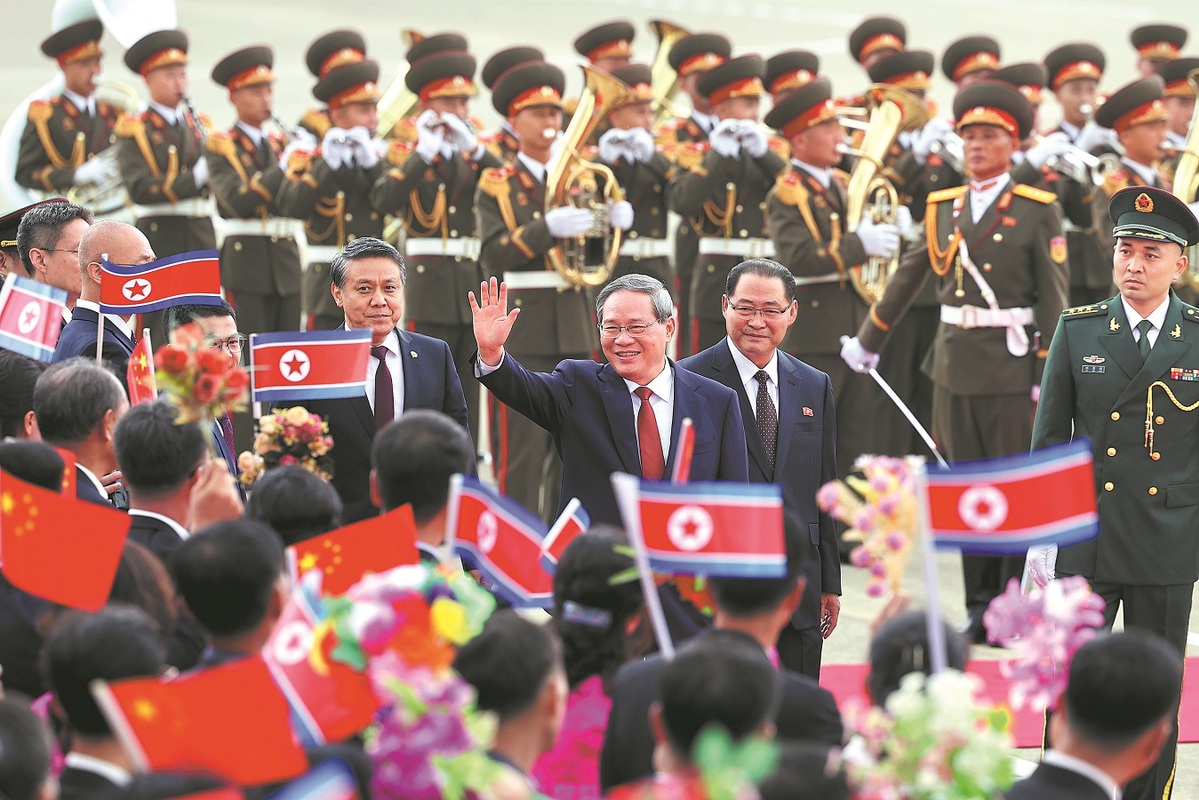 Premier Li Qiang (center) waves to a cheering crowd on Thursday upon his arrival at Pyongyang Sunan International Airport in the Democratic People's Republic of Korea. Pak Thae-song (right), premier of the DPRK Cabinet and presidium member of the Political Bureau of the Workers' Party of Korea Central Committee, and Wang Yajun, Chinese ambassador to the DPRK, were present to welcome him. Li is making an official goodwill visit to the DPRK and will attend the 80th anniversary celebrations of the WPK. WANG ZHUANGFEI/CHINA DAILY