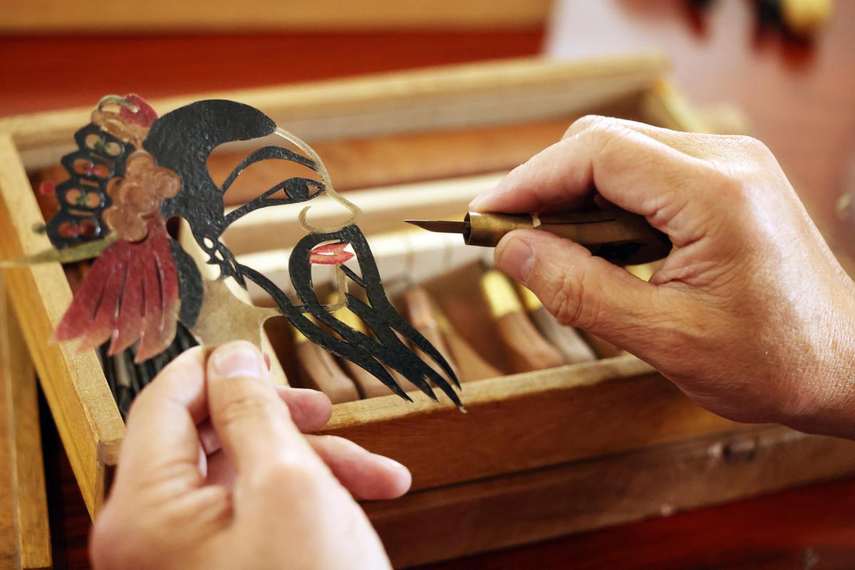 Hou observes and carves the head of a shadow puppet. ZHU XINGXIN/CHINA DAILY