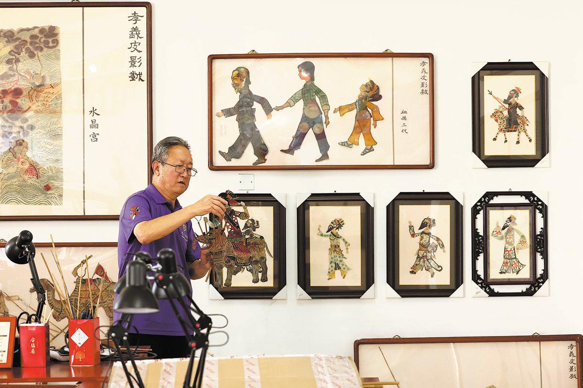 Hou checks his shadow puppets at his studio in Xiaoyi. ZHU XINGXIN/CHINA DAILY