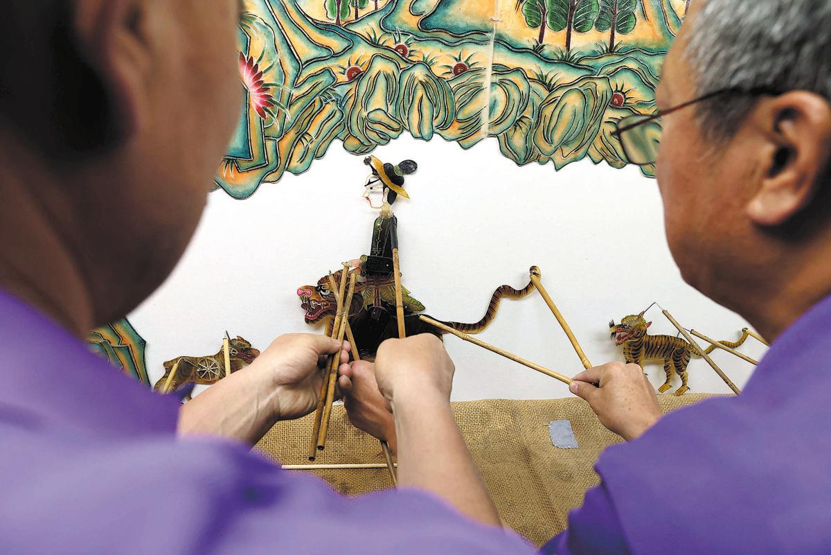 Hou (right) and a colleague operate a shadow puppet together during a show. ZHU XINGXIN/CHINA DAILY