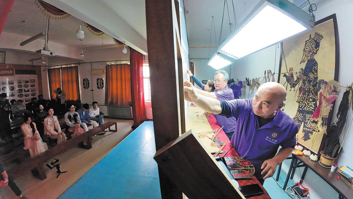 Members of a shadow puppetry troupe prepare to start a show at a theater in Xiaoyi. ZHU XINGXIN/CHINA DAILY