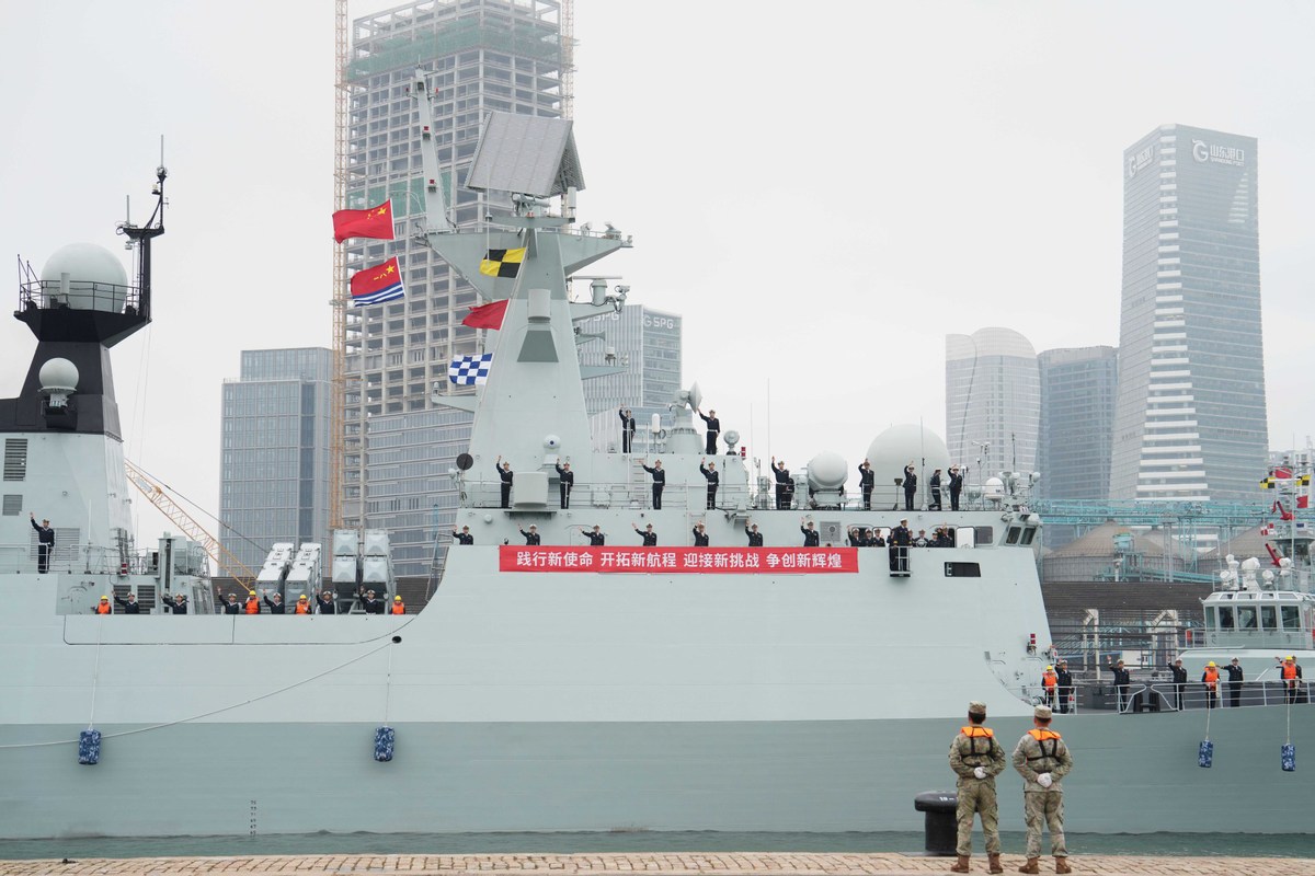 Officers and soldiers wave goodbye at a port in Qingdao, East China's Shandong province, Oct 11, 2025. [Photo/Xinhua]