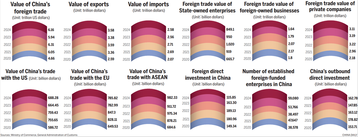 Meanwhile, China's trade with the Association of Southeast Asian Nations, Latin America, Africa and Central Asia rose 9.6 percent, 3.9 percent, 19.5 percent and 16.7 percent year-on-year, respectively. Trade with economies participating in the Belt and Road Initiative also climbed 6.2 percent year-on-year, accounting for 51.7 percent of China's total imports and exports — up 1.1 percentage points from a year earlier.