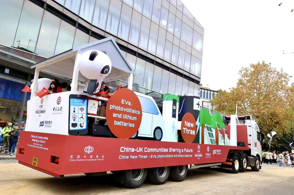 Another Chinese contingent, representing the China Chamber of Commerce in the UK, or CCCUK, highlighted China's advancements in green technology, featuring new energy vehicles, lithium batteries, and solar panels.