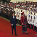Liberia's President Ellen Johnson-Sirleaf (L) and China's President Hu Jintao listen to Liberia's national anthem during a welcome ceremony at the Great Hall of the People in Beijing November 1, 2006. [Reuters]