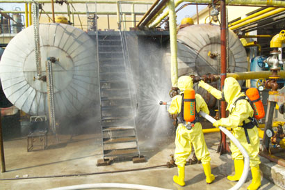 Fire fighters sprayed water into the air in shifts to dissipate the gas. The