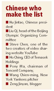 Hu on Time list of 'influentials'By Guan XiaofengUpdated: 2007-05-05 08:58 President Hu Jintao and Liu Qi, head of the Beijing Olympic organizing committee, are on the annual list of the 100 most influential people in the world, released on Friday by the US weekly magazine Time.