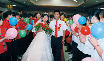 A pair of newlyweds walks down the aisle as wedding attendees applaud in Tianjin Municipality June 28, 2007. Three pairs of couples, all of whom migrant workers, tied the knot with the help of a local company. [Xinhua]