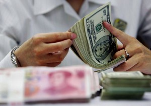 A bank teller counts the stack of Chinese yuan and US dollars at a bank in Shanghai. [Agencies]