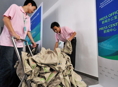 Workers prepare environmentally-friendly press kits in Boao, Hainan Province April 10, 2008. The Boao Forum for Asia 2008 meeting will open on April 12. [Xinhua]