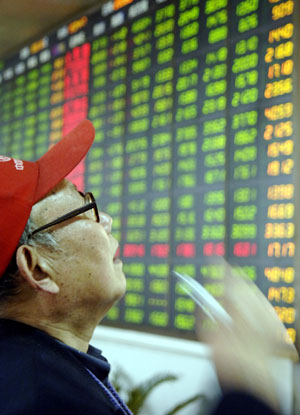 An elder stock investor looks at an electronic screen at a brokerage house in Hefei, east China's Anhui Province April 14, 2008. China's main stock index lost more than 5.6 percent in early trade on Monday as investors cashed out of banking stocks amid worries over the country's persistently high inflation, with sentiment also hit by weakness on Wall Street. [Xinhua]