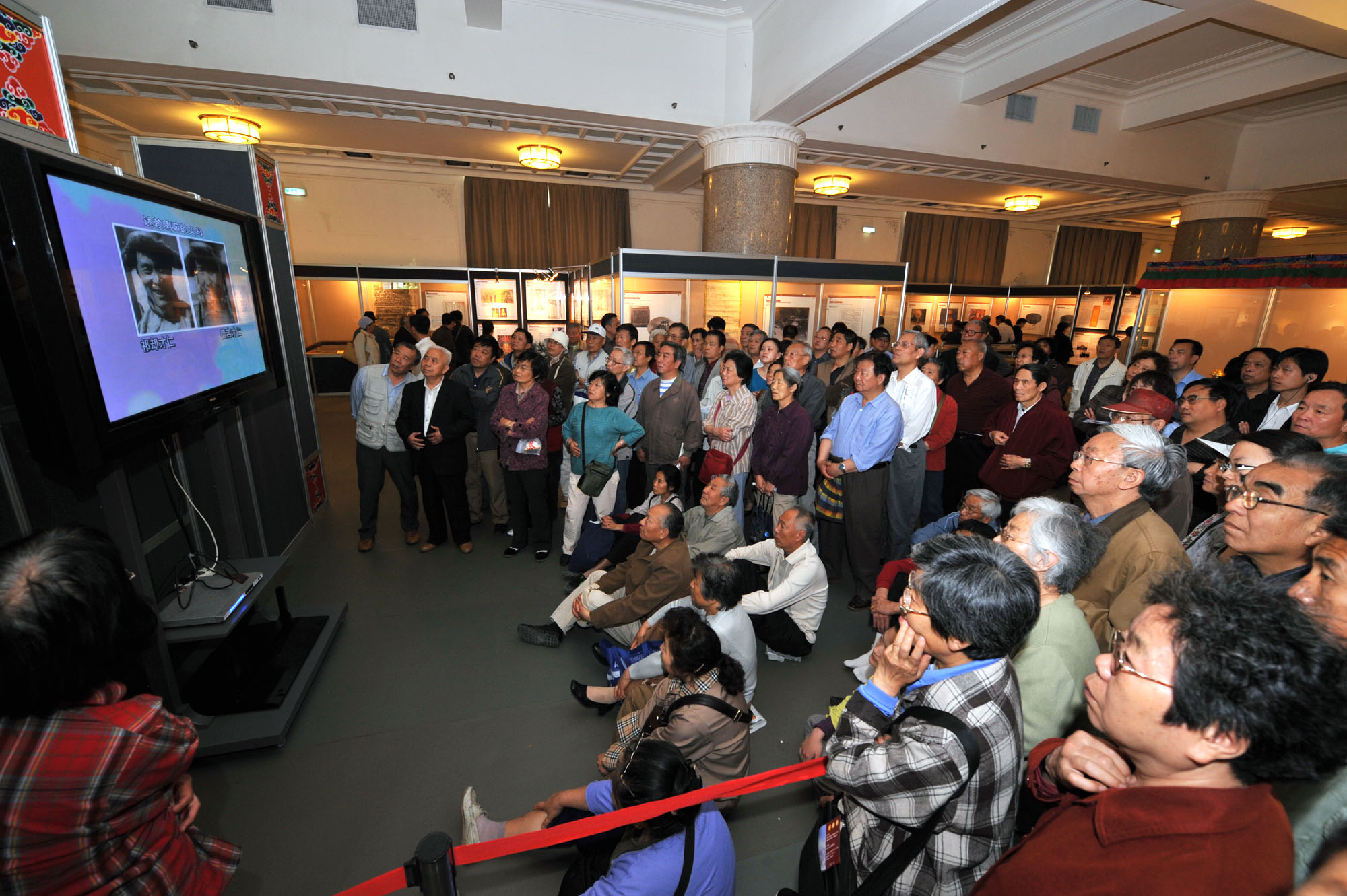 Visitors watch a video at the exhibition "Tibet of China: Past and Present" at the Cultural Palace of Nationalities in Beijing May 5, 2005.  [Xinhua]