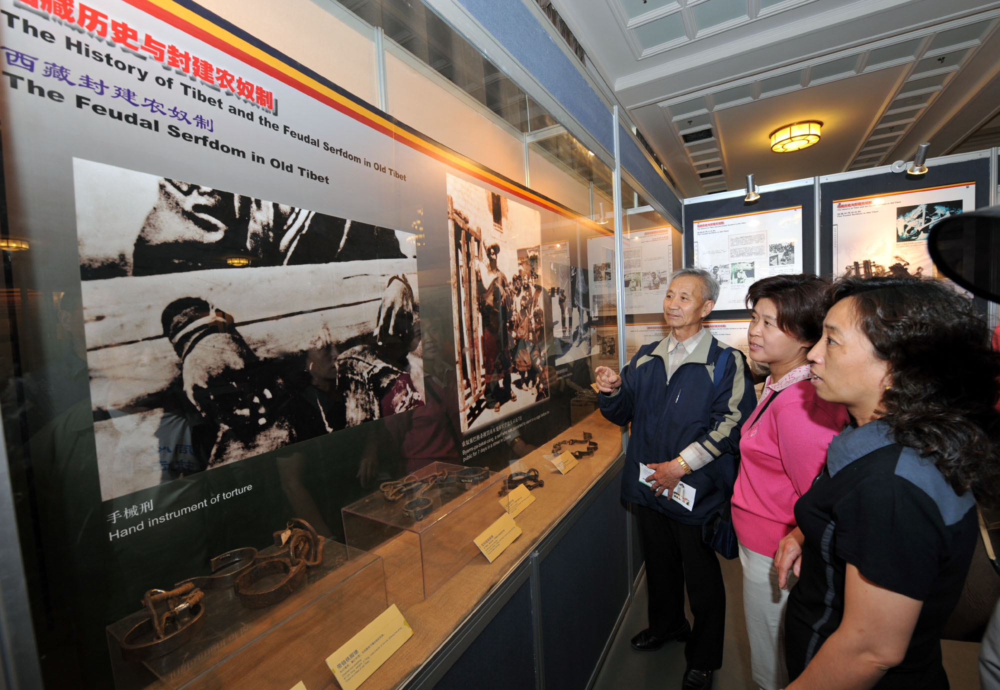 Visitors stop and have a close look at a photo at the exhibition "Tibet of China: Past and Present" at the Cultural Palace of Nationalities in Beijing May 5, 2005.  [Xinhua]