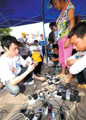 A volunteer (left) helps quake victims recharge their cellphones in Tumen town, Mianzhu city, May 19 2008. [Xinhua]