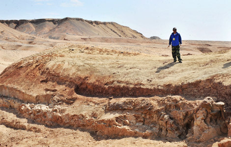 The largest Jurassic dinosaur fossil in China is discovered by Chinese paleontologists in Shanshan county, Turfan region in Northwest China's Xinjiang Uygur autonomous region, April 15, 2012. [Photo/Asianewsphoto]