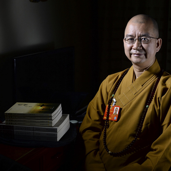 Master Xuecheng poses with his books in Beijing, on March 5, 2013. Master Xuecheng is a CPPCC National Committee member and the abbot of Longquan Temple. He dreams of establishing a university for Buddhist followers and ascetics to study Buddhism and the Buddhist culture deeply and systematically. [Photo/Xinhua]