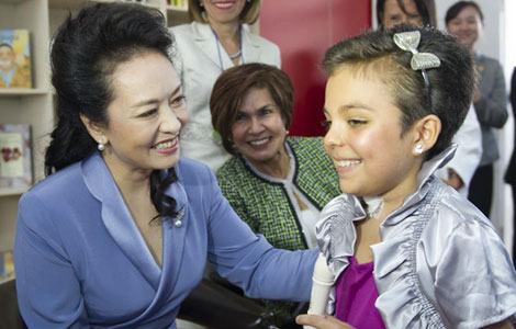 China's first lady Peng Liyuan visits the National Children's Hospital of Costa Rica, accompanied by Emilce Miranda, mother of Costa Rican President Laura Chinchilla, in San Jose, June 3, 2013.