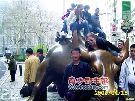 中國日報網(wǎng)環(huán)球在線消息:美國紐約華爾街上有一頭青銅公牛塑像,被認為是華爾街的標(biāo)志,也是游客們最喜歡留影的一個景點。來自世界各國、美國各地的與銅牛合影的游客,很多人都喜歡騎到牛身上去照相。2007年11月,一些中國游客騎牛拍照的時候被中國北京電視臺的主持人看到了,主持人拍了幾張照片,幾天后貼在了自己博客里。