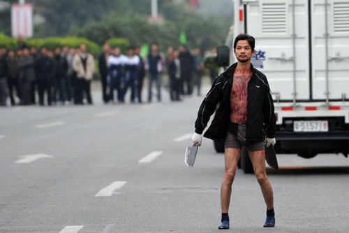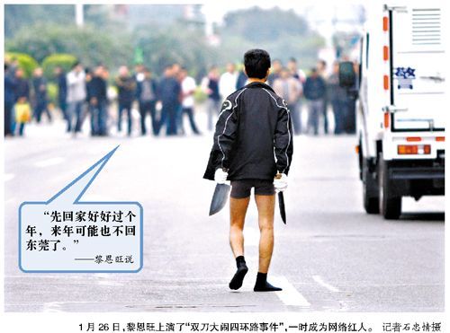1月26日,黎恩旺向原工作單位索要三萬元開發(fā)廊店,遭到拒絕當即脫掉衣褲,持兩把殺豬刀大鬧東莞四環(huán)路。隨后,在媒體的報道下,以其桀驁的表情、經典的話語,迅速走紅網絡,被稱“雙刀男”。他自稱“沒衣服、沒飯吃,就只能去偷去搶。并不是我不想做好人,是家庭環(huán)境、社會現實沒有給我機會。有錢人什么都有,我連煙都沒得抽。與其茍且活著,不如通過這樣來改變命運?!?/p>