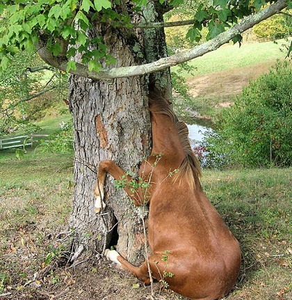 當(dāng)時這匹雌性小馬駒可能是好奇地把腦袋伸進(jìn)樹窟窿內(nèi)一探究竟,但是當(dāng)它想將頭縮回時卻發(fā)現(xiàn)根本不可能——它越是試圖縮回來,頭越是卡得厲害。當(dāng)時的情形就像是動畫片維尼熊中,貪吃的維尼熊頭被卡在蜂蜜罐里一樣,非?;?。