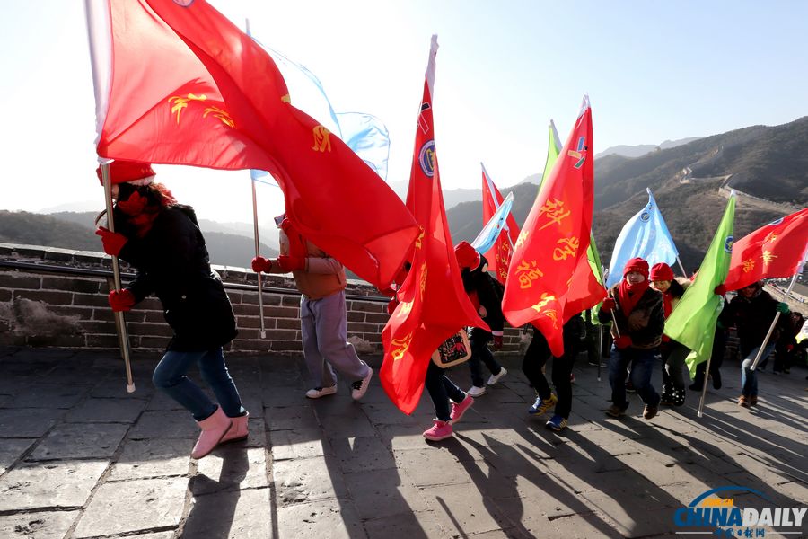 2014年1月1日,2014名登山愛好者冒嚴(yán)寒興致勃勃登上北京八達嶺長城,以登山健身的方式迎接新年的到來。