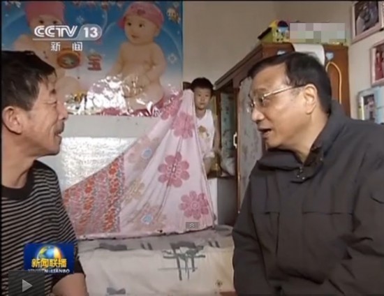 李克強(qiáng)和居民談話時(shí),小朋友從柜子里面溜了出來(lái),掀起被子。