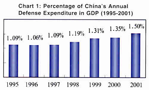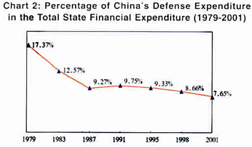 The Chinese government has always been strict in its control, management and supervision of defense spending, and has established a complete system of relevant laws and regulations for that purpose. Pursuant to the National Defense Law of the PRC, the entire defense expenditure comes from the state financial budget. In order to meet the defense needs, the Chinese government exercises a system of financial appropriation of defense funds, and implements administration in accordance with the Budget Law of the PRC. China's defense budget and final accounts are reviewed and approved by the NPC. The state and armed forces' auditing organs exercise strict auditing and supervision of the execution process of the budget. In recent years, in line with financing and budgeting reforms in the government, the administration of defense expenditure has undergone a whole array of reforms, including reform in the defense expenditure budgeting method, centralized payment for weapon and equipment procurement, and a tendering and bidding system for the procurement of defense materials, projects and services. Defense funds are therefore managed in a more just, fair and transparent way. Based on the continuous economic growth, China's defense expenditure has increased somewhat. The proportion of annual defense spending in the GDP was 1.09% in 1995, and 1.50% in 2001 (see Chart 1). However, China's defense expenditure has been kept at a fairly low level, and the increased part is basically of a compensatory nature. From 1979 to 2001, the proportion of defense expenditure in the state financial spending is on a declining curve (see Chart 2) from 17.37% in 1979 to 7.65% in 2001 - a drop of nearly 10 percentage points.
