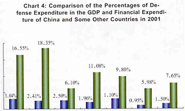 The increased defense expenditure in recent years has primarily been for the following purposes: ①Increase of personnel expenses. Along with the socio-economic development and the per-capita income rise of rural and urban residents, it is necessary to improve the living standards and conditions of military personnel. The past decade has witnessed the increase of the board expenses in the armed forces on five occasions, and an 84% salary raise for officers and 92% allowance raise for soldiers. ②Establishment and gradual improvement of a social security system for servicemen. In accordance with the requirements of the market economy, China has, since 1998, established such systems as injury and death insurance for servicemen, medical insurance for demobilized servicemen and housing subsidies for servicemen, and adjusted and enhanced living expense standards for PLA retirees. ③Increase of expenses of a maintenance nature. Since the armed forces stopped commercial activities in 1998, the budget for training has increased year by year. With the gradual improvement of living facilities and progressive office automation, expenses of a maintenance nature have kept rising. ④Increase of expenses spent on cooperation with the international community in anti-terrorism activities. 5.Appropriate increase of expenses for the improvement of military equipment to enhance defense capabilities under the conditions of modern technologies, particularly high technologies. On the whole, China's defense expenditure has remained at a fairly low level in the world in 2002 (see Chart 3). Compared with the USA, Russia, UK and France, the percentage of China's defense expenditure in its GDP and the state financial expenditure is also fairly low (see Chart 4).