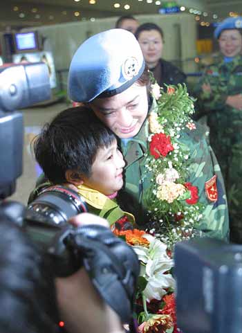to the Democratic Republic of Congo embraces her child upon arriving at