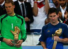 托馬斯·穆勒(左)若能在決賽中取得進(jìn)球,他將奪得本屆杯賽的金靴。圖片來(lái)源:新華社/REX