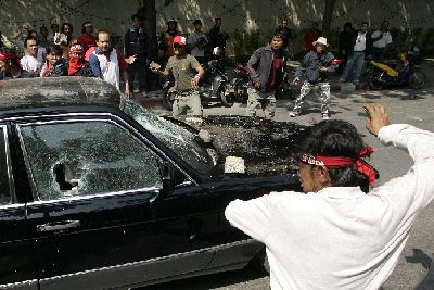 “紅衫軍”在國(guó)會(huì)大廈外抗議阿披實(shí)當(dāng)選總理,向議員車(chē)輛投擲石塊