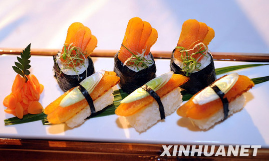 中國日報網消息:據新華網消息,30日,“2009十大金鉆烏魚子競賽頒獎典禮”在臺北舉行,評委根據養(yǎng)殖記錄、烏魚子的外觀和風味,評選出了十大優(yōu)質烏魚子。頒獎活動現場還展示了多家大飯店主廚制作的烏魚子創(chuàng)意美食。