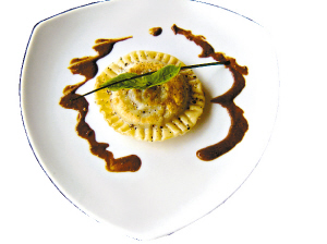 這道菜做法比較復雜,鴨子要用香料、粗鹽腌一整天,然后再用鴨油慢火浸幾個小時,之后拆肉包成云吞。它和法國油鴨的做法比較相似,味道甘香。鵝肝燒汁則是用燒牛骨、牛筋、茄膏熬制24小時,再用調(diào)料浸過的鵝肝一起打成蓉,然后再煮成黏稠的醬汁。