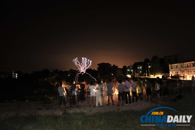 8月13日,長(zhǎng)樂(lè)市鶴上鎮(zhèn)大厝村的村民在觀看特斯拉線圈閃電表演。 (柳濤 攝)