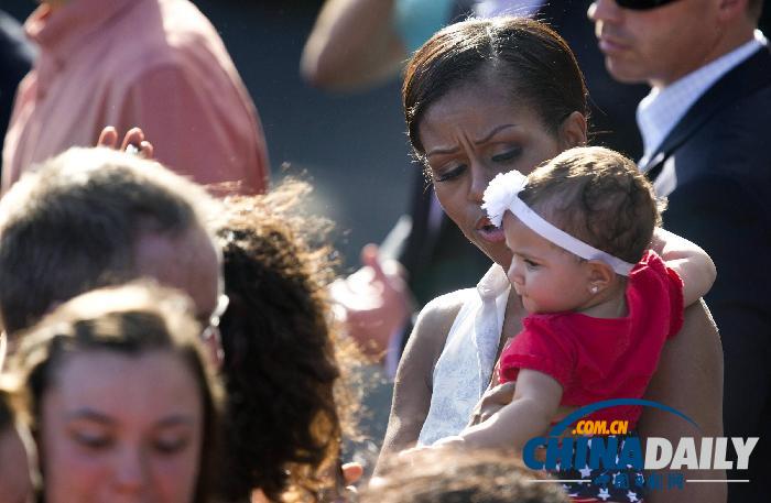 7月4日美國(guó)獨(dú)立紀(jì)念日,圖為白宮附近第一夫人米歇爾抱著一個(gè)嬰兒向人們示意。