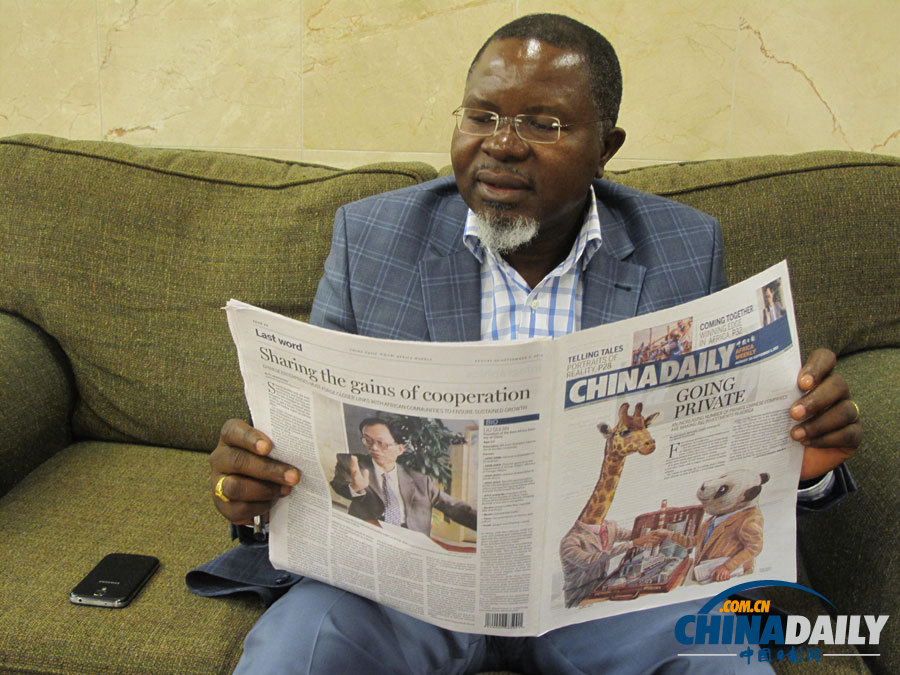 莫桑比克前部長(zhǎng)若澤·齊查瓦(Jose Chichawa)在閱讀《中國(guó)日?qǐng)?bào)》(非洲版)。(中國(guó)日?qǐng)?bào) 王超 攝)