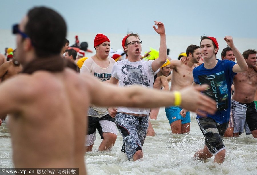 當(dāng)?shù)貢r(shí)間2014年1月4日,比利時(shí)奧斯坦德,民眾參加傳統(tǒng)冬泳活動(dòng),慶祝一年的開(kāi)始。