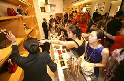 Chinese shoppers select the luxury Louis Vuitton luggage at the first franchise store in Nanjing, East China's Jiangsu Province, July 25, 2007. [newsphoto]