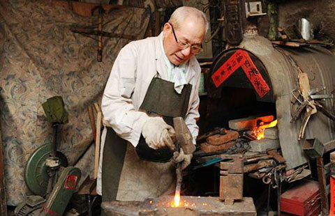 2015-04-15Blacksmith Tian Hongming, 64, works in his traditional workshop in Changchun, capital of Northeast China's Jilin province.