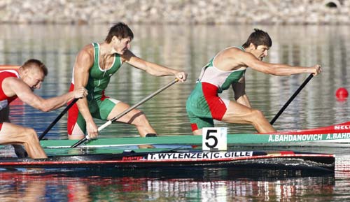 Andrei (R) and Aliaksandr Bahdanovich of Belarus paddle to win their men's canoe double C2 1000m final of the Beijing 2008 Olympic Games at Shunyi Olympic Rowing-Canoeing Park north of Beijing, August 22, 2008. [Agencies]