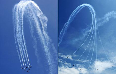 Two chaplains from Canada and Belgium watch a performance of the Rebel 300 aerobatic aircraft flown by Tony Blair of Australia's Blair Aerosports during an aerial display at the Singapore Airshow in Singapore Feb 16, 2012. The largest airshow in Asia runs from Feb 14 to Feb 19. [Photo/Agencies]