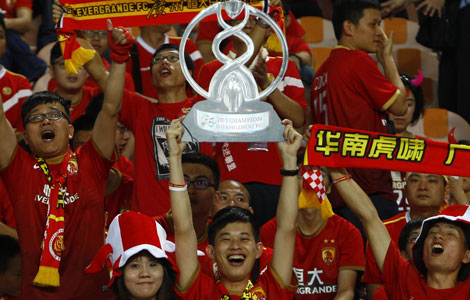 Football players of Guangzhou Evergrande celebrate their winning of the AFC Champions League against South Korea's FC Seoul at Tianhe stadium in the southern Chinese city of Guangzhou Nov 9, 2013.[Photo/Xinhua]