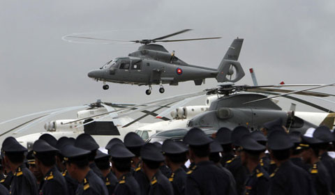 Chinese-built Zhi-9 helicopters at a handover ceremony in Phnom Penh, Nov 25, 2013. [Photo/Xinhua] |